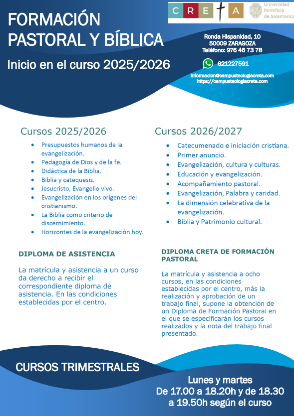 - Para más información enviar un correo a secretaria@cretateologia.es o llamar por teléfono al 976 46 73 78